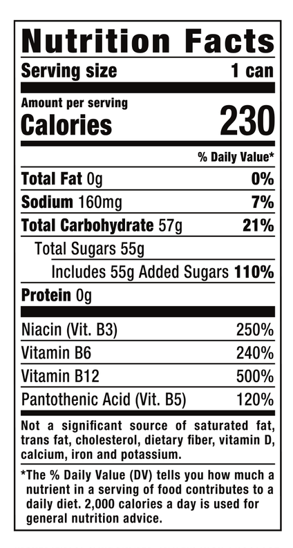 INGREDIENTS: CARBONATED WATER, HIGH FRUCTOSE CORN SYRUP, CITRIC ACID, SUGAR, NATURAL AND ARTIFICIAL FLAVORS, SODIUM CITRATE, SODIUM BENZOATE (PRESERVATIVE), D-RIBOSE, CAFFEINE, GUM ACACIA, VITAMIN B3 (NIACINAMIDE), VITAMIN B5 (CALCIUM D-PANTOTHENATE), GLYCEROL ESTER OF ROSIN, VITAMIN B6 (PYRIDOXINE HYDROCHLORIDE), YELLOW 5, VITAMIN B12 (CYANOCOBALAMIN).